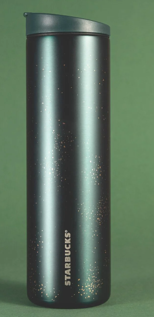 高挑、流線又典雅的設計,這款深綠色不鏽鋼隨行杯點綴著閃爍金色細點與精緻光澤,為每一口飲品增添一份奢華氣息。